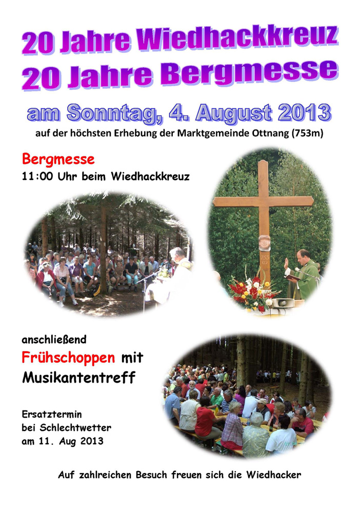 „20 Jahre Wiehackkreuz“ und „20 Jahre Bergmesse“ Am 28. August 1993 wurde vom Wiedhackmaschinverein Bruckmühl das 3,50 m hohe Eichenkreuz auf der höchsten Erhebung der Gemeinde Ottnang (753m) aufgestellt und am Sonntag, den 29. August vom damalige Pfarrer Niemyjski von Bruckmühl geweiht. Seither findet jährlich, am 1. Sonntag im August um 11:00 Uhr, die Bergmesse der Wiedhacker statt. Die Jubiläumsmesse wurde von Pfarrer KR Mag. Konrad Enzenhofer gefeiert und von einer Abordnung des Hausruckchors Ottnang/Plötzenedt sowie dem Ottnanger Hochzeitsbläser musikalisch umrahmt. Wir bedanken uns herzlich bei den über 200 Besuchern, die unsere Jubiläumsbergmesse und den Frühschoppen besuchten. Ein besonderer Dank gilt den Sängern und Musikanten, die kostenlos sangen und musizierten, sowie beim anschließenden Frühschoppen für hervorragende Stimmung sorgten.Danke sagen wir auch den Fotografen, Josef Waldhör, Johann Ledermüller, Walter Bertich und vor allem Willi Groiß (Info Ottnang). |