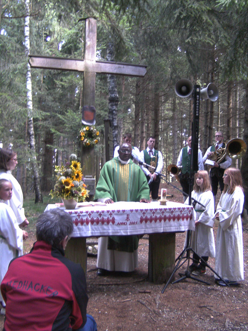 Um die 200 Wanderer marschierten auf die höchste Erhebung (753m) der Marktgemeinde Ottnang, um bei dem alljährlich um 11:00 Uhr stattfindendem Ereignis dabei zu sein. Erstmals wurde die Hl. Messe von Rev. Fr. John Mary Scenfuka aus Uganda zelebriert und vom Bläserquartett des MV Bruckmühl musikalisch umrahmt. Bei dem anschließenden Frühschoppen konnten sich die Besucher wieder stärken für den Rückmarsch. Danke allen Besuchern und Mitwirkenden.